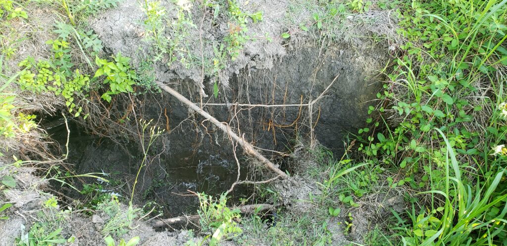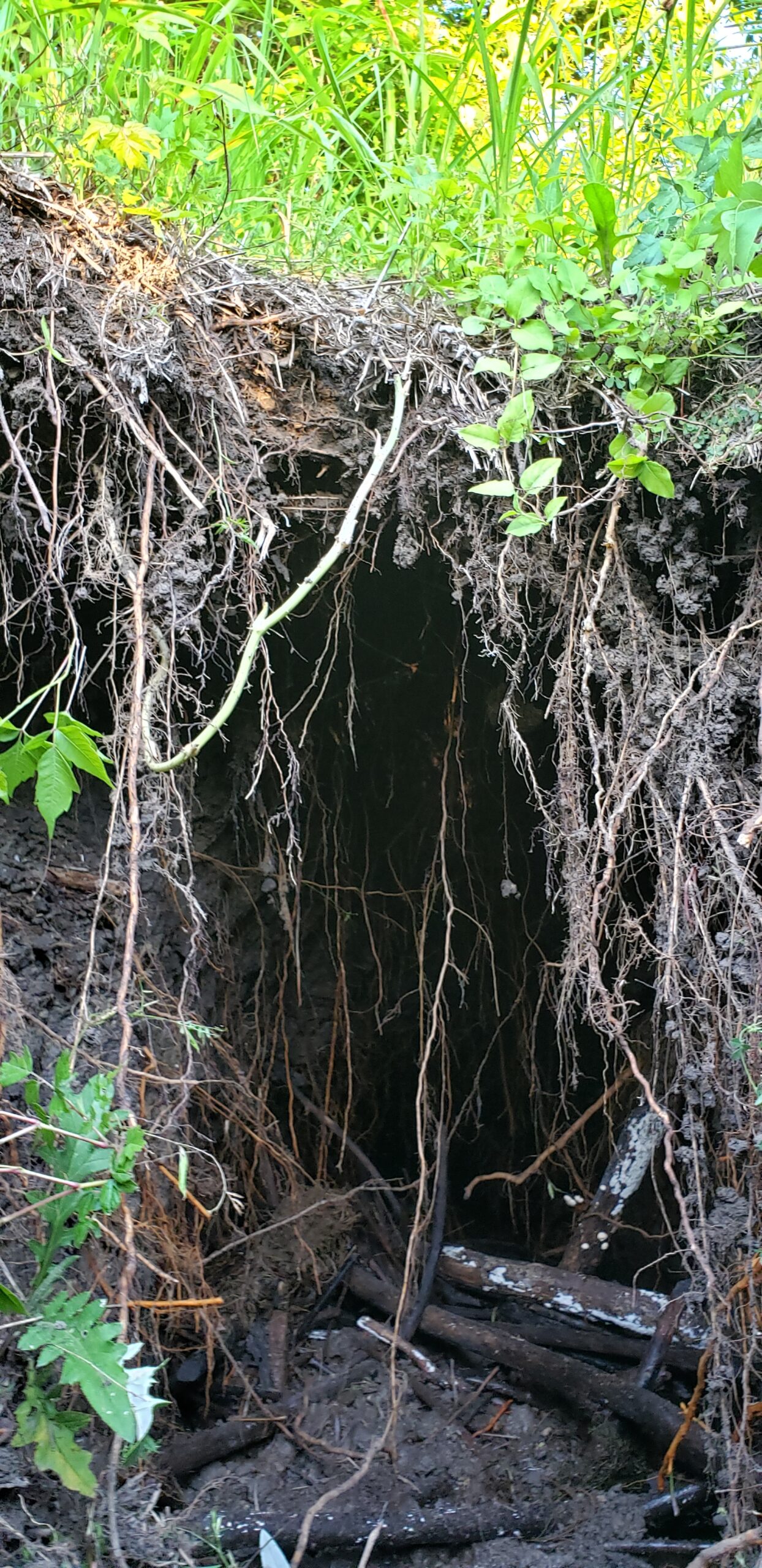 An old beaver lodge collapsed, and left a pretty good sized gap in my dam. The pond on the left is full of lilly pads, and now all that water flows thru the collapse and thru the main pond out to the spillway. This is going to take some serious planning in order to fix this, and I dont know when this will happen. 🙁